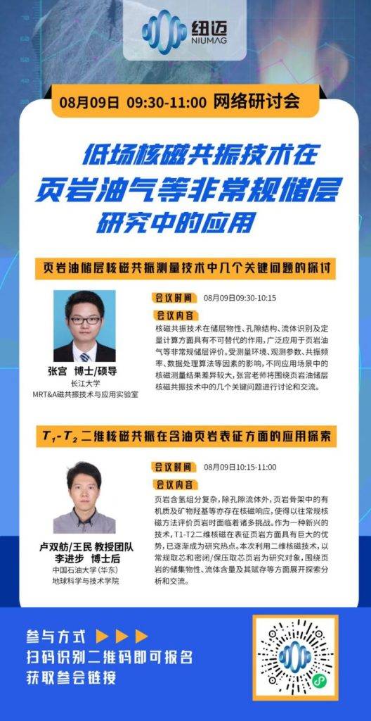 为给能源领域的学者们提供新的研究思路,华体会官方网页版分析特邀请了两位专家就低场核磁共振技术在页岩油气等非常规储层研究中的应用进行汇报。希望专家们的报告能让大家对低场核磁技术在油气勘探开发方面有更深层次的了解,也希望通过此次网络研讨会,大家一起相互交流分享,碰撞出思想的火花。