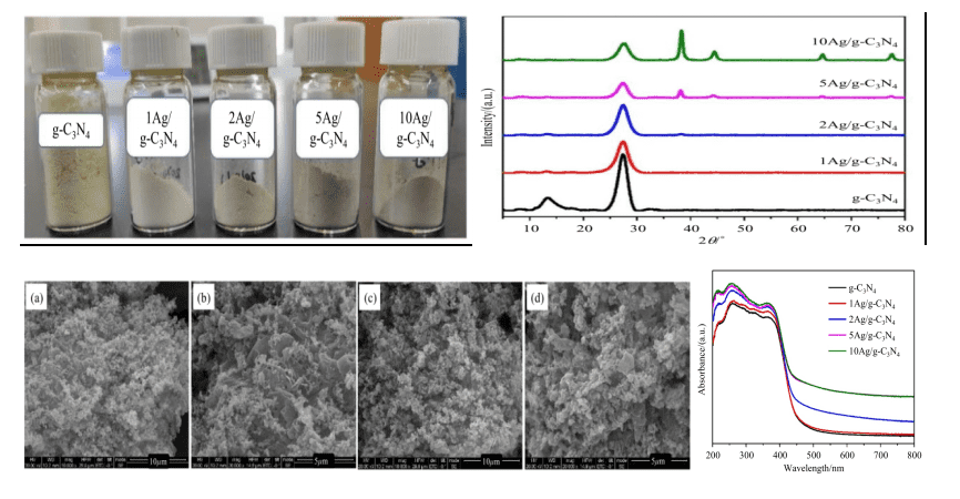 作者通过XRD 图谱、SEM 测试、UV-Vis 吸收光谱等表征手段分析了催化剂的体相结构、光学特性。研究发现,纯g-C3N4的吸收边大约在460 nm,与其2.7eV的禁带宽度一致。与纯g-C3N4相比,Ag纳米颗粒负载的复合光催化剂的可见光吸收强度明显增加,且吸收边缘均发生显著红移,从而拓宽了催化剂的可见光响应范围。随着 Ag负载量的增多,催化剂的红移程度和可见光吸收强度也随之增加。因此复合光催化剂能够更有效的吸收太阳能,从而产生更多的光生电子和空穴,促进光催化活性。