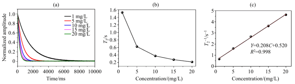 图3 Cr(III)体系的(a)CMPG 衰减曲线,(b)T2和(c)1/T2随着Cr(III)离子浓度(1-20 mg/L)的变化