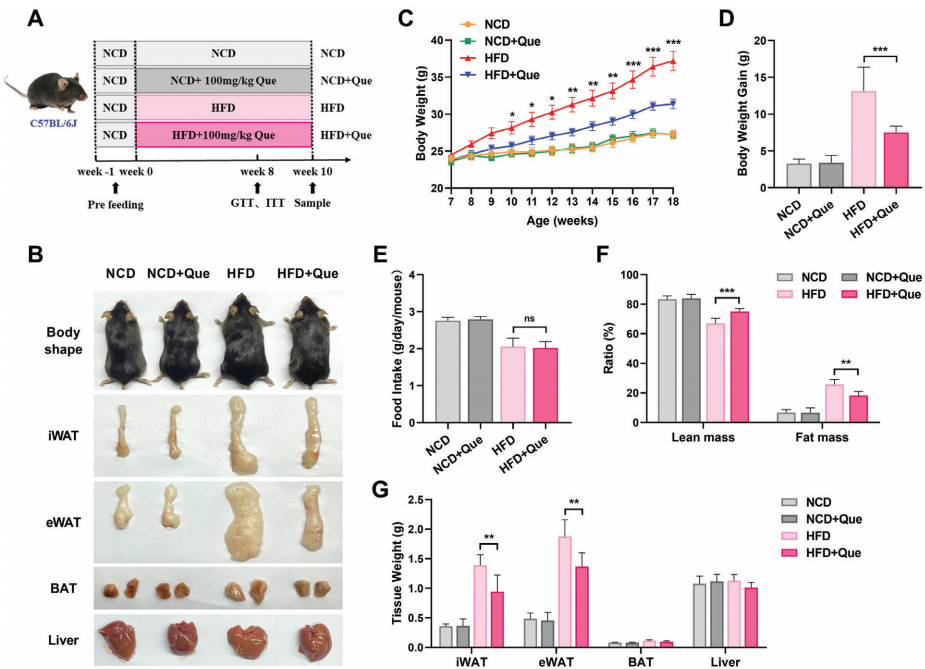 这篇发表于2025年的顶刊文章,不仅揭示了槲皮素抗肥胖的新机制,更向我们展示了现代化代谢研究的标准范式: