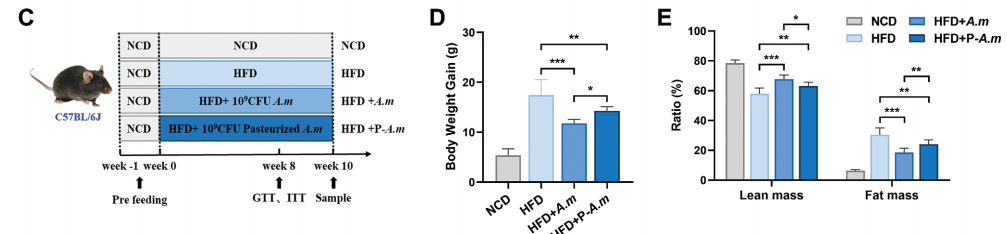 Figure 2E 数据显示: 直接给肥胖小鼠灌胃AKK菌后,QMR检测再次捕捉到了体脂率的显著下降。